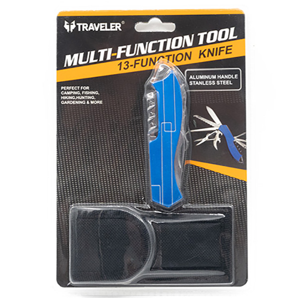 Многофункционален нож с 10 инструмента: ножица, отварачка, мини трион 2 броя, нож 2 броя, тирбушон, отвертка, мини пили 2 броя;