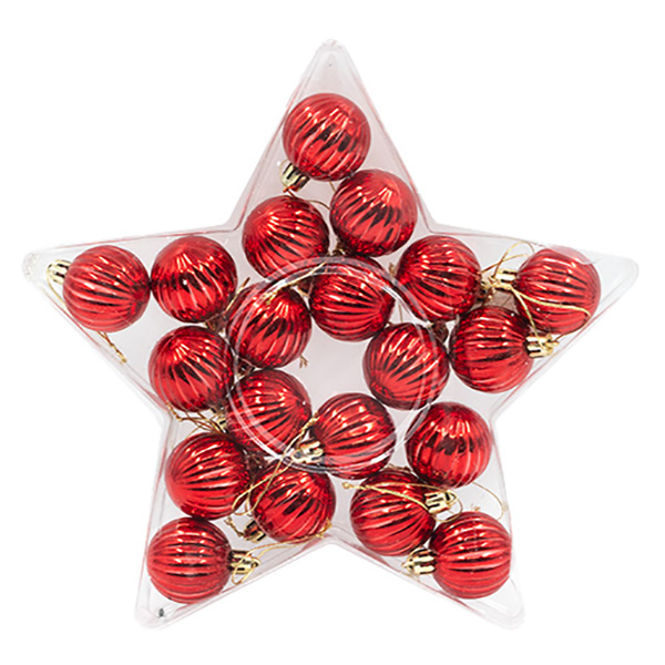 Коледни играчки за елха топки 4 см 20 бр в кутия звезда Червено са изработени от твърда и устойчива пластмаса.