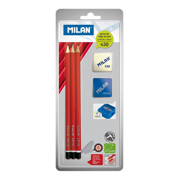 Комплекта съдържа 3 броя моливи, гума и острилка.
