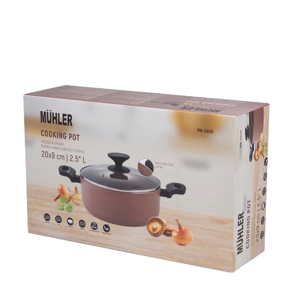 Тенджера алуминий Muhler е изработена от висококачествен пресован алуминий с незалепващо покритие, с мраморен ефект.