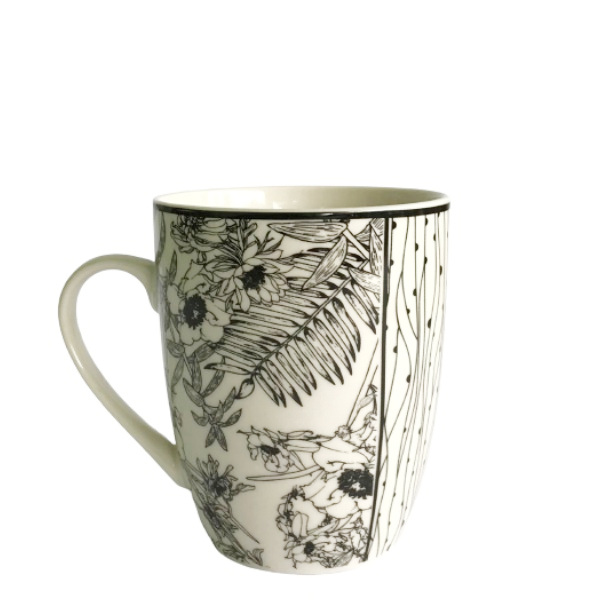 Керамична чаша в черно и бяло направена от лесно чуплив материал.