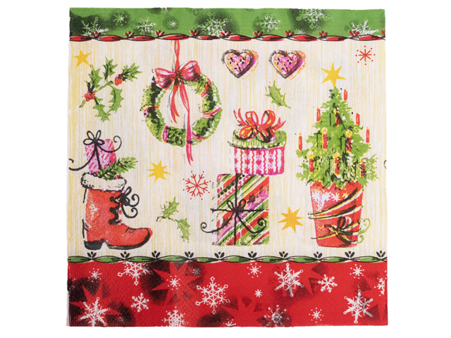 Коледни салфетки 33/33 см 20 броя шарена Коледа са изработени от преработена дървесина, съобразно всички установени стандарти за качество и безопасност.