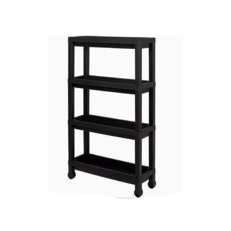 Стелаж правоъгълен колелца 4 нива черен слим е изработен от здрава и устойчива пластмаса.