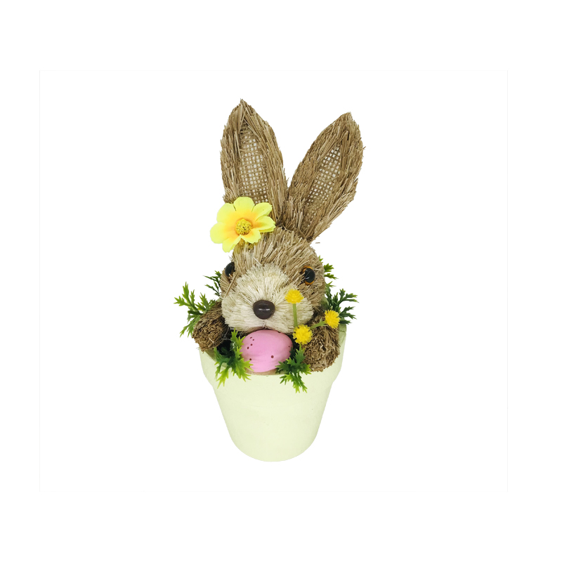 Дизайн: Кашпата е в нежно зелено и съдържа малък заек, което придава игрив и празничен вид.